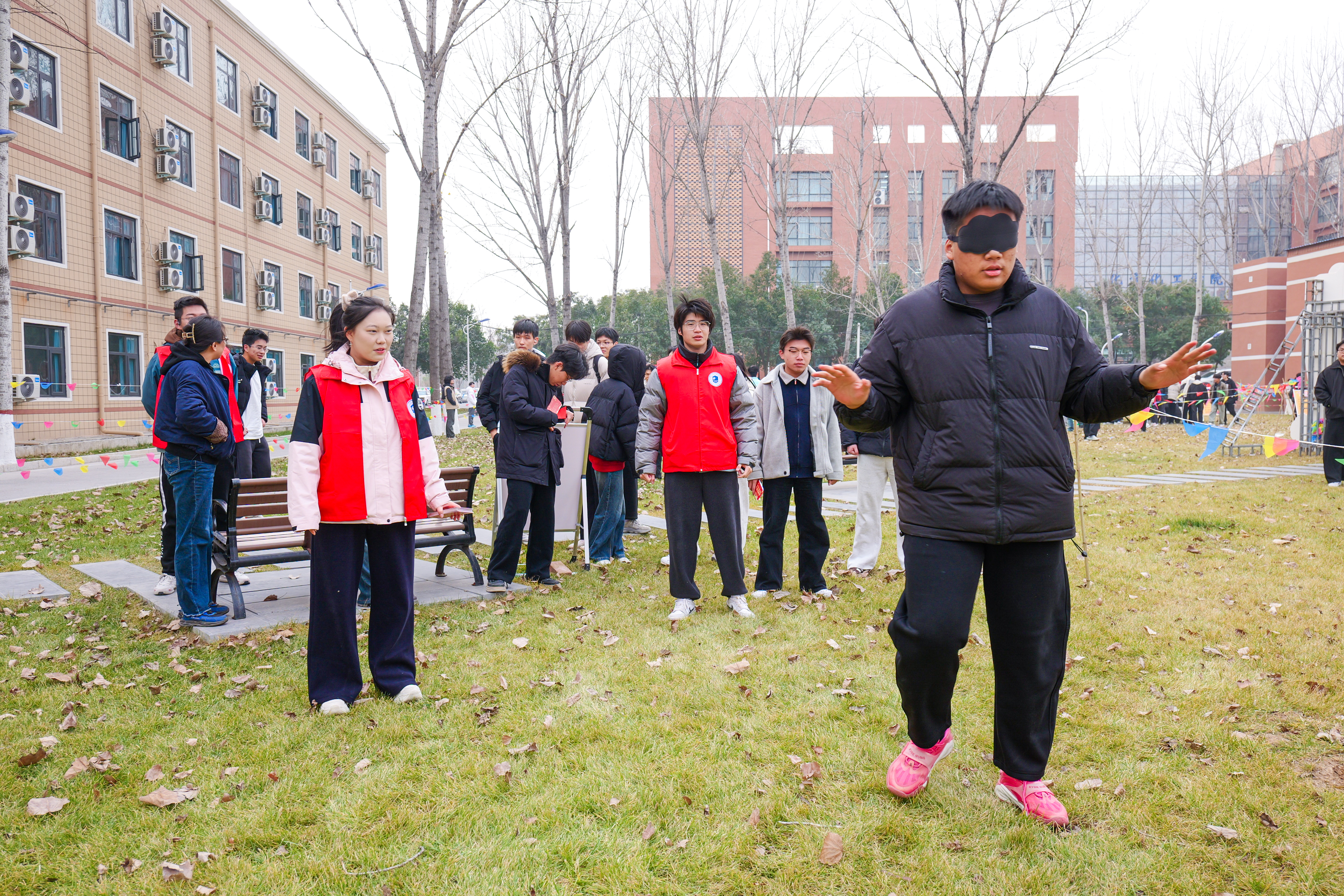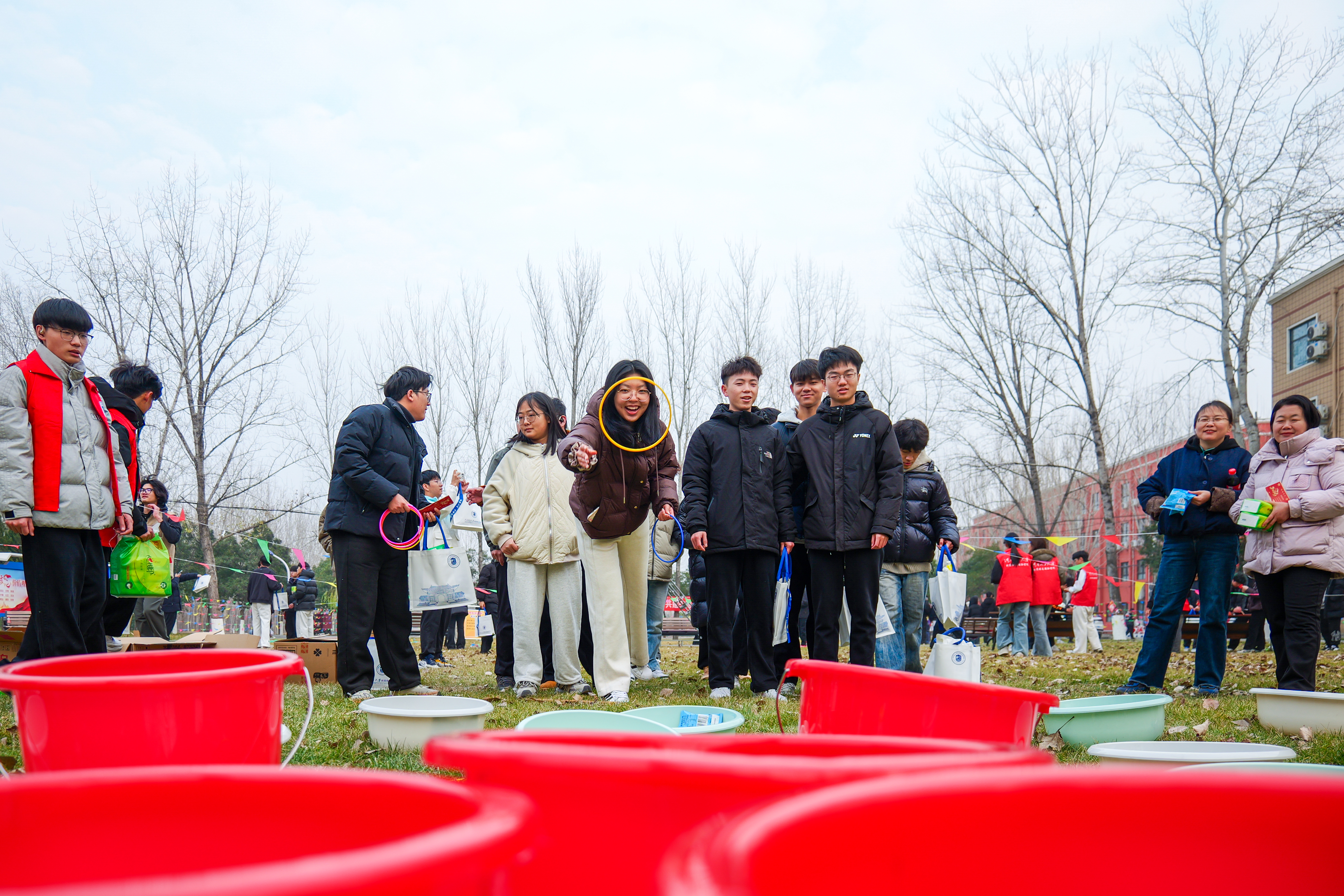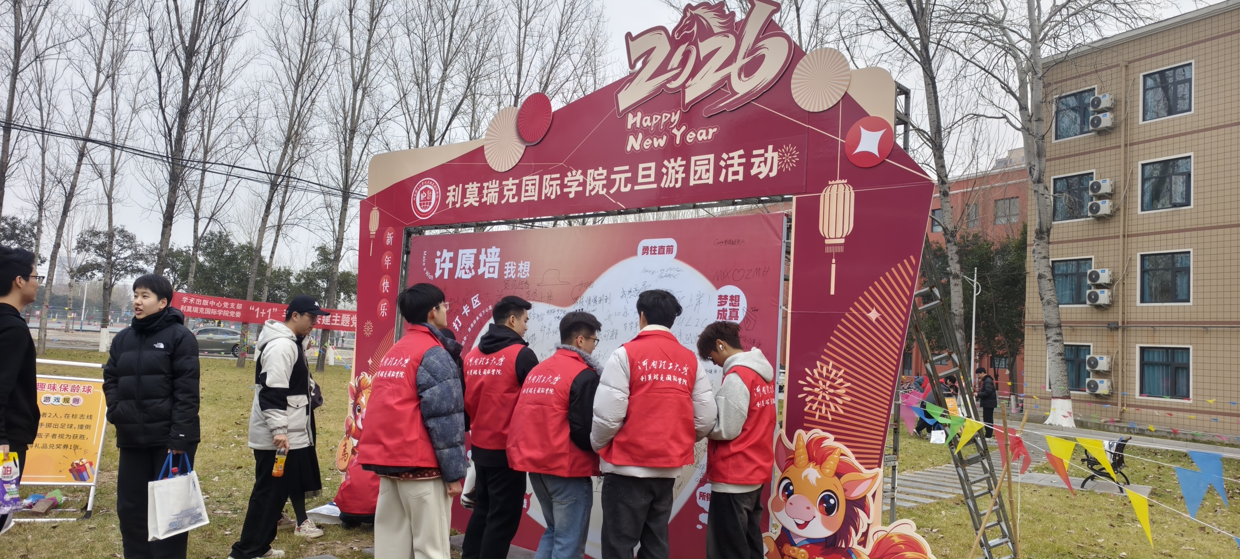 楼前张灯结彩,红展板、小彩旗相映成趣,游戏区域依次排开,工作人员在各自点位引导秩序,洋溢着浓浓的新年气息。